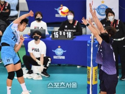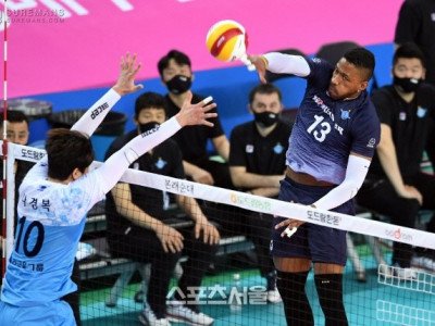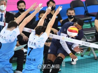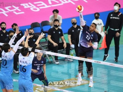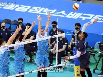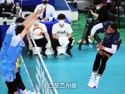 11일 인천 계양체육관에서 열린 도드람 2020-2021 V리그 남자부 대한항공과 우리카드의 챔피언결정전 1차전에서 대한항공 요스바니의 공격이 우리카드 블로킹 벽에 막히고 있다. 2021. 4. 11. 인천 | 박진업기자 upandup@sportsseoul.com