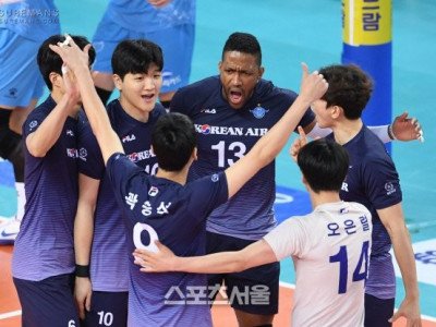 대한항공 선수들이 11일 인천 계양체육관에서 열린 도드람 2020-2021 V리그 남자부 대한항공과 우리카드의 챔피언결정전 1차전에서 득점을 한 뒤 기뻐하고 있다. 2021. 4. 11. 인천 | 박진업기자 upandup@sportsseoul.com