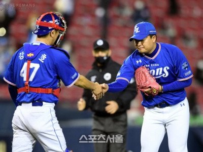 삼성 투수 심창민이 8일 서울 잠실야구장에서 열린 2021 KBO리그 두산 베어스와 삼성 라이온즈의 경기 후 포수 강민호와 악수를 하고 있다.2021. 4. 8.잠실 | 최승섭기자 thunder@sportsseoul.com