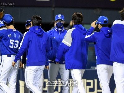 삼성 허삼영 감독(가운데)이 8일 서울 잠실야구장에서 열린 2021 KBO리그 두산 베어스와 삼성 라이온즈의 경기 후 선수들을 격려하고 있다. 2021. 4. 8.잠실 | 최승섭기자 thunder@sportsseoul.com