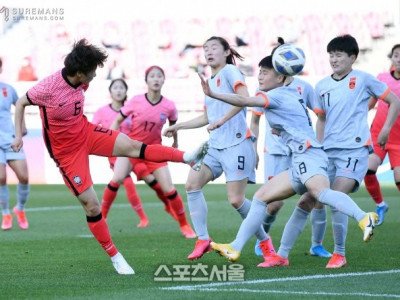 한국의 임선주(왼쪽)가 8일 고양종합운동장에서 열린 2020 도쿄올림픽 여자축구 아시아 최종 예선 플레이오프 1차전에서 헤더슛을 하고 있다. 2021. 4. 8. 고양 | 박진업기자 upandup@sportsseoul.com
