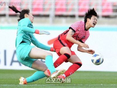 한국의 손화연(오른쪽)이 8일 고양종합운동장에서 열린 2020 도쿄올림픽 여자축구 아시아 최종 예선 플레이오프 1차전에서 중국 골키퍼 펭 시멩과 충돌하며 넘어지고 있다. 2021. 4. 8. 고양 | 박진업기자 upandup@sportsseoul.com