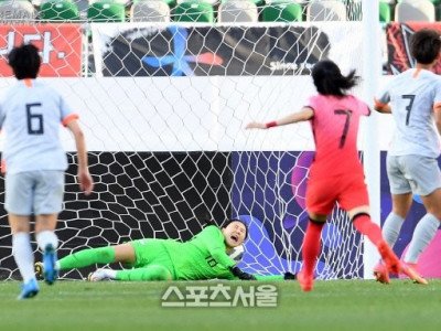한국의 골키퍼 김정미(가운데)이 8일 고양종합운동장에서 열린 2020 도쿄올림픽 여자축구 아시아 최종 예선 플레이오프 1차전에서 중국 왕슈앙의 페널티킥을 향해 몸을 날렸으나 실점하고 있다. 2021. 4. 8. 고양 | 박진업기자 upandup@sportsseoul.com
